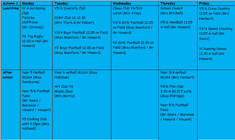 There are a range of extra-curricular activities run by the school. These clubs are not part of the main curriculum although they are run in school, either at lunchtime or after school. They look to provide children with an interesting, wide reaching, variety of experiences to help them further enjoy their time in our care.