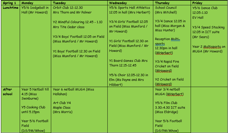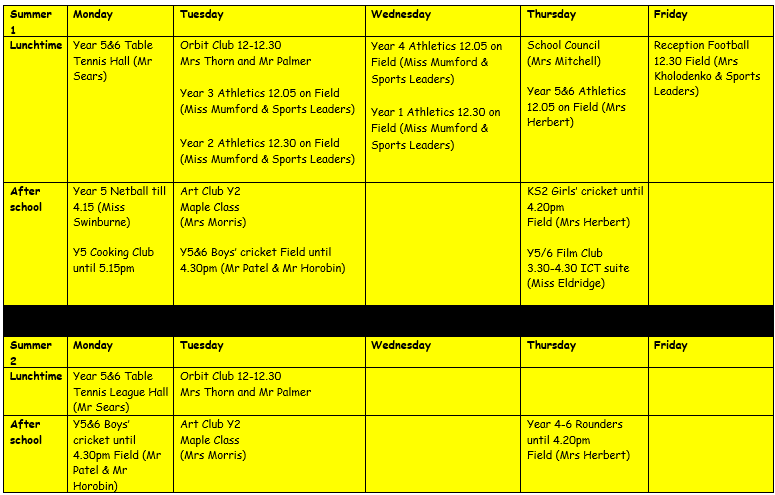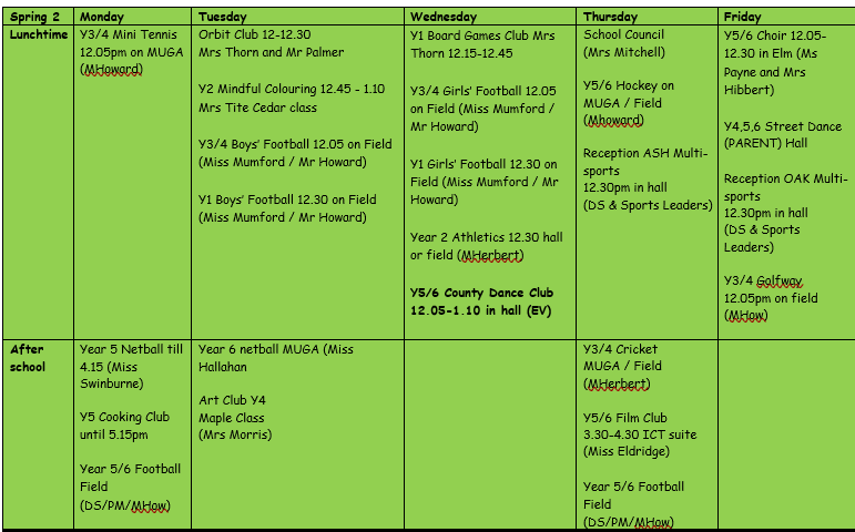 In the 2024-25 year, the following clubs were available to the children – all were free of charge, except ‘Year 5 Get Cooking’ which incurs a small cost to cover cooking ingredients.