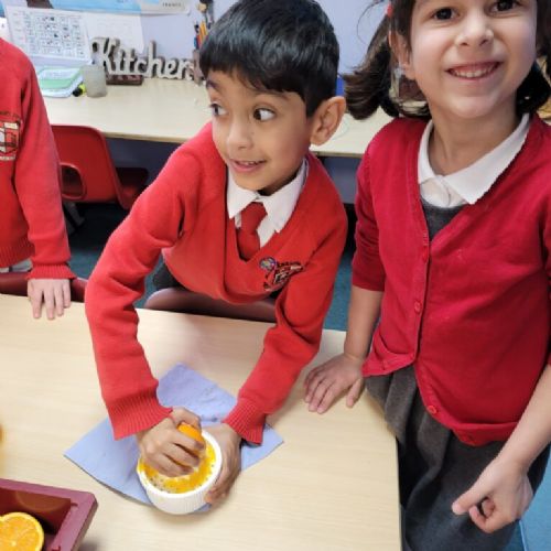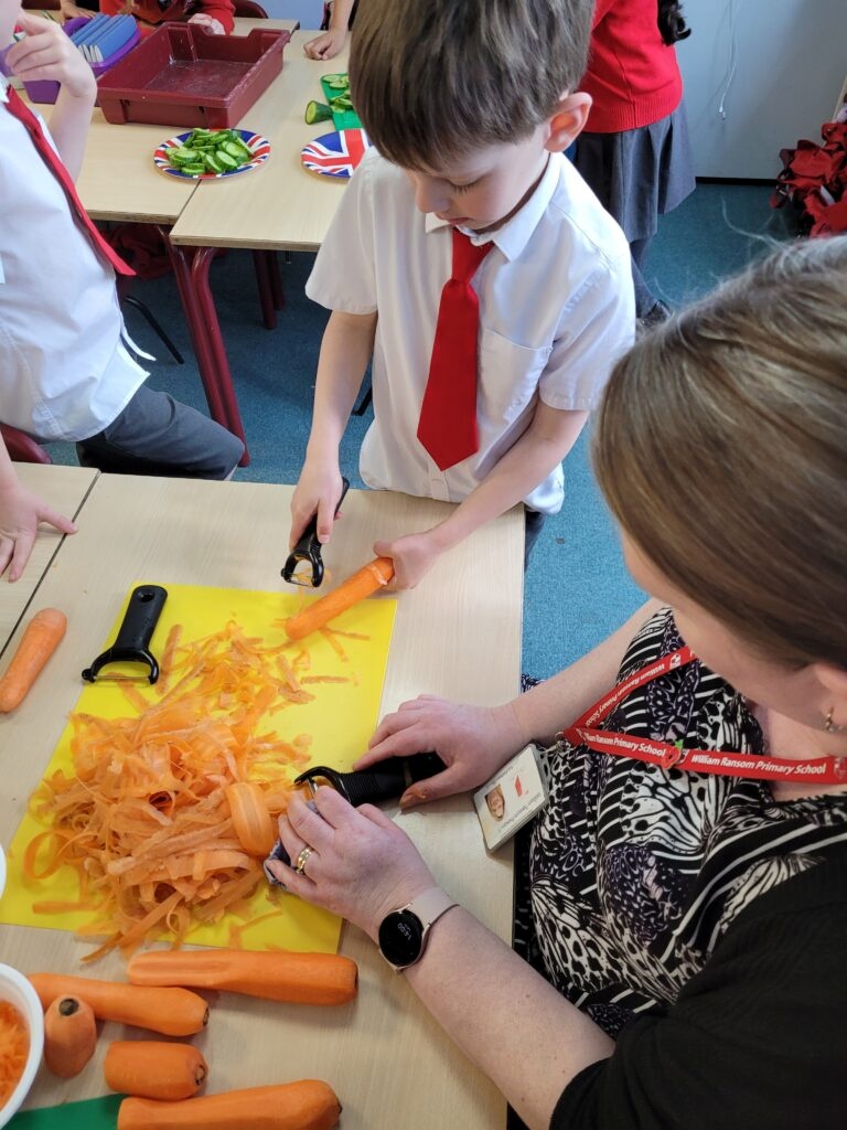 We developed lots of skills useful when preparing food including: chopping, squeezing, grating and peeling. The children then designed their own healthy kebab, made them and enjoyed eating them!
