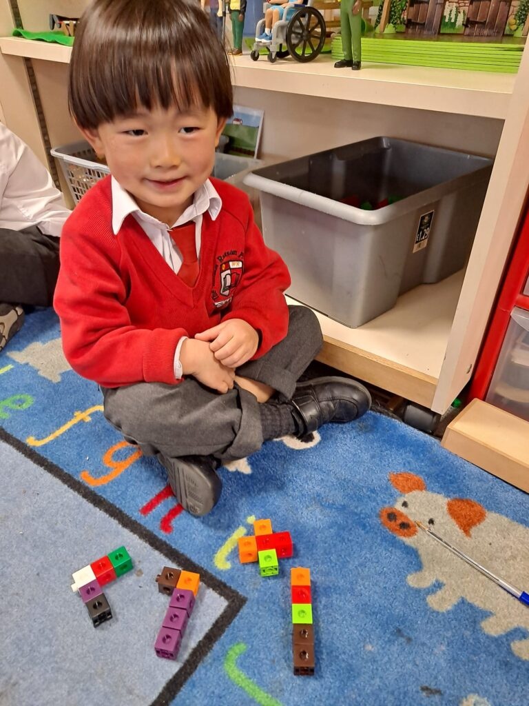 Adult directed time saw the children investigating different shapes they could make using only 5 cubes. Could they find all possible combinations? Some chose to continue their investigating in their Discover & Do time.